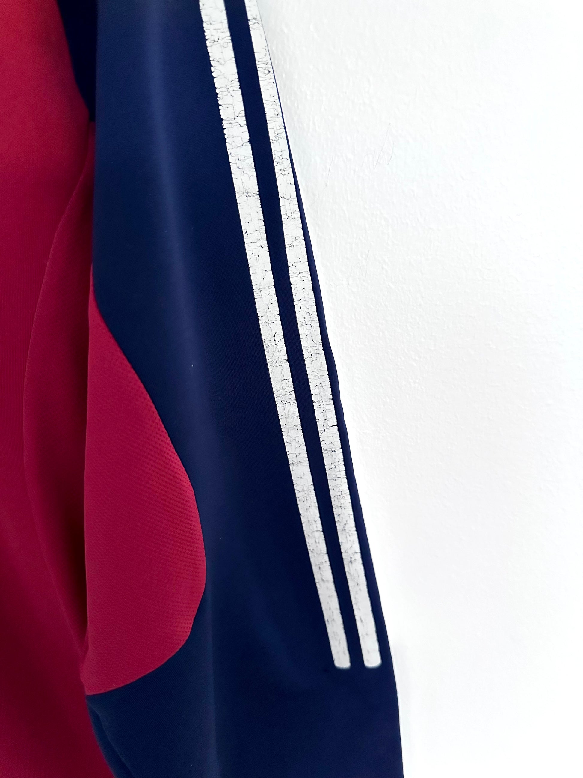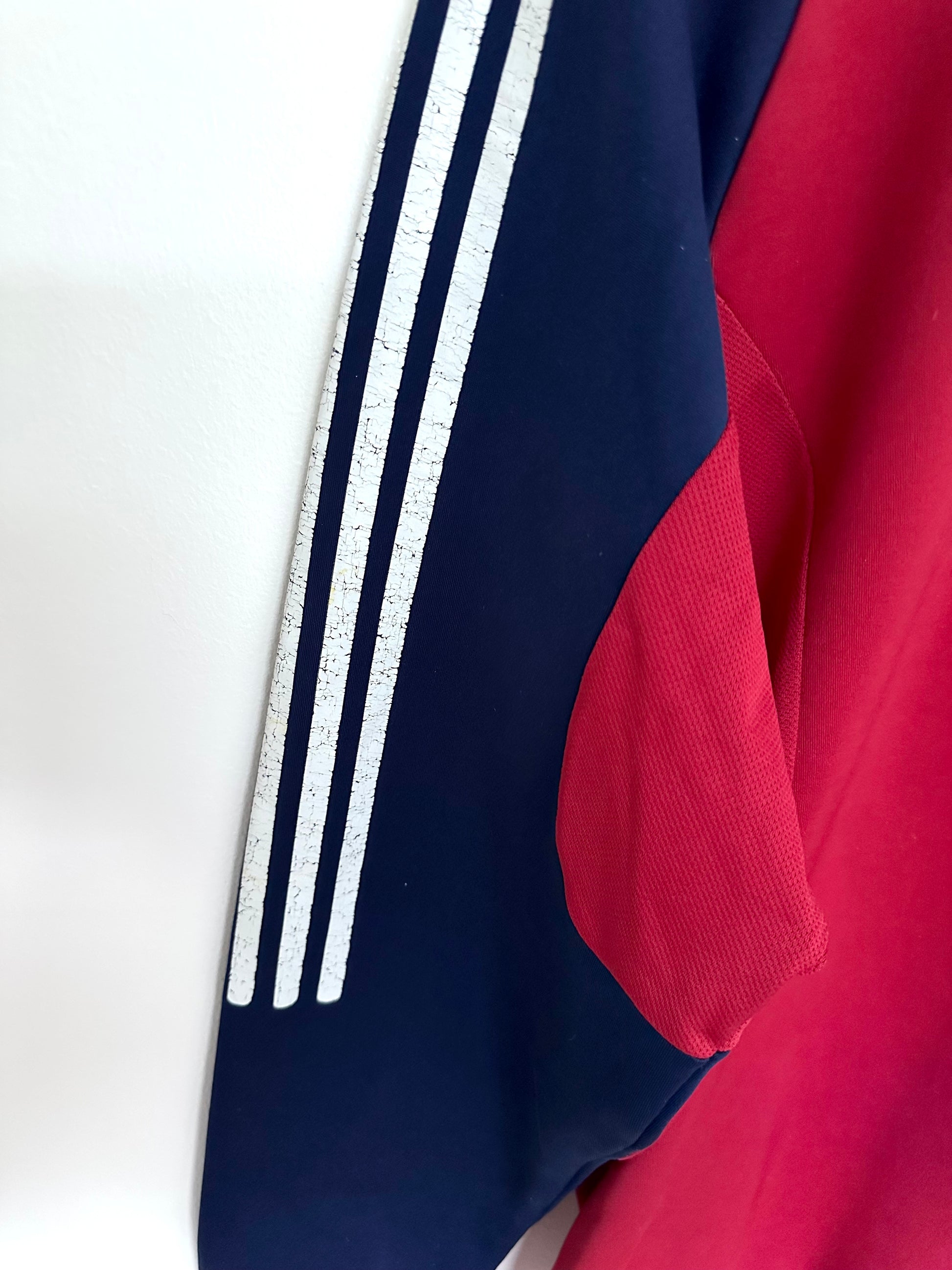 Vintage adidas training sweatshirt from the early 2000s in a bold red/burgundy and navy colorway. Features an embroidered Adidas logo on the chest, signature three-stripe sleeves, and breathable mesh side panels. Made with ClimaWarm performance fabric for lightweight warmth and comfort. A strong Y2K-era sportswear piece with a technical, athletic silhouette.